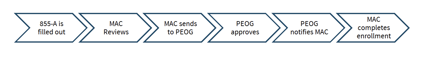 After meeting all the FQHC requirements, the facilities and providers must go through the enrollment process with Medicare which is done through the internet-based Provider Enrollment Chain and Ownership System (PECOS) or using the paper application (855-A). After the application is submitted, the process of completion begins and is likely to flow the chart below.