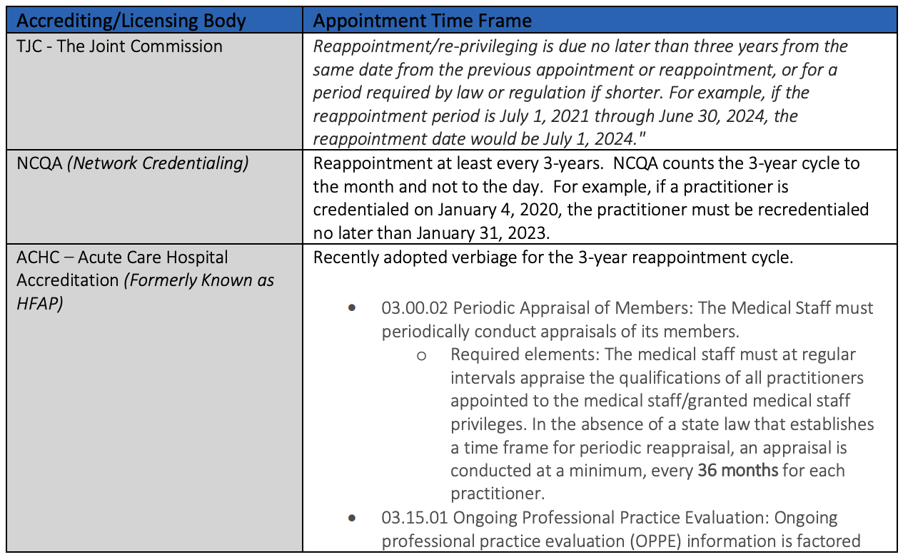 Historically, accreditation and licensing bodies have varied in terms of the length of the reappointment. While some have followed the Joint Commission requiring a 2-year (not to exceed than 24 months) reappointment cycle, others have required a 3-year (not to exceed 36 months) reappointment cycle. The Joint Commission (founded in 1951) is the nation’s oldest and largest standards-setting and accrediting body in health care.