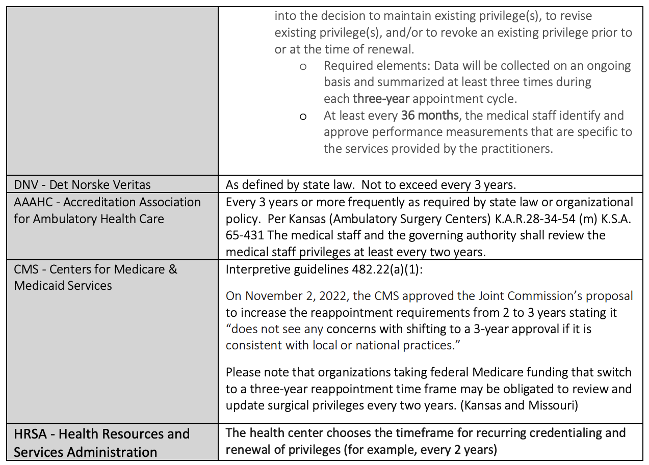 Please note that organizations taking federal Medicare funding that switch to a three-year reappointment time cycle, will be required to adhere to the state laws and may be obligated to review and update surgical privileges every two years. (Kansas and Missouri) 4 Revised 7/31/2024 The transition to a 3-year reappointment cycle will take time as facilities that have traditionally reappointed every 2-years will need to consider their medical staff bylaws, policies and procedures, and other considerations.